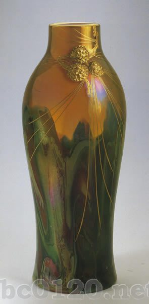 1902年以降 ハラホフ・ガラス工房 ノヴィー・スヴェット 高さ30cm 国立工芸美術館, プラハ "ピス"ガラス:琥珀色ガラス,大理石・虹彩装飾,金彩レリーフ装飾。出所:『ボヘミアのアールヌーヴォーグラス展』 Bohemian Art Nouveau Glass