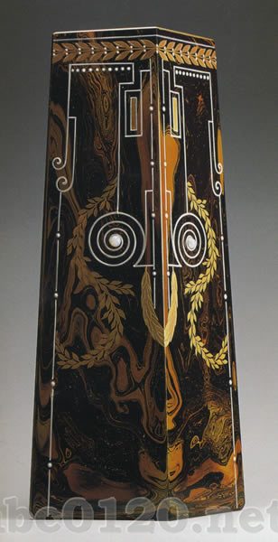 1900年以降 ヨゼフ・リーデル ポルブニー 高さ28.7cm 地区美術館,クラトヴィ 茶と黄色のマーブル(大理石模様)・ガラス,カット,白のエナメル彩,金彩,模造石を熔着。出所:『ボヘミアのアールヌーヴォーグラス展』 Bohemian Art Nouveau Glass