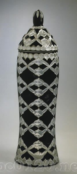 1913年 制作:ヨハン・エルテル商会,ボル 高さ33.8cm 国立工芸美術館、プラハ 無色ガラス,白と黒のオパールの被せガラス,カット。出所:『ボヘミアのアールヌーヴォーグラス展』 Bohemian Art Nouveau Glass