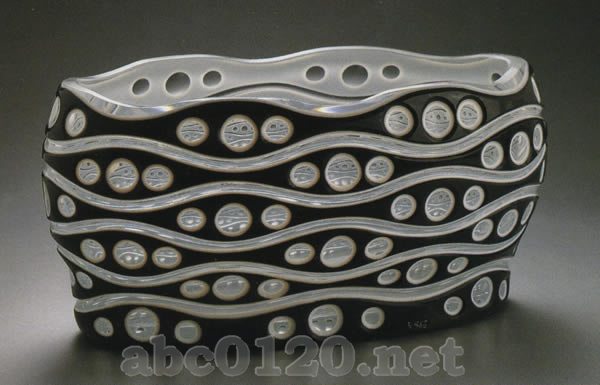1913年 カール・シャペル ボル 長径18.4cm 国立工芸美術館, プラハ "ボルシア″ガラス、無色ガラス,白と黒色オパールの被せガラス, カット。出所:『ボヘミアのアールヌーヴォーグラス展』 Bohemian Art Nouveau Glass