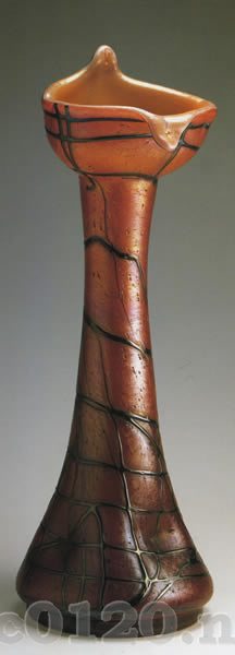 1900ー05年 エリーザベト工場(ヴィルヘルム・ハベル) テプリツェ近郊のコシュチャニー 高さ34.2cm 国立工芸美術館,プラハ 無色ガラス,ピンクの粉末の重層によるピンク系オパールの被せガラス,紫色の線状装飾,虹彩。出所:『ボヘミアのアールヌーヴォーグラス展』 Bohemian Art Nouveau Glass