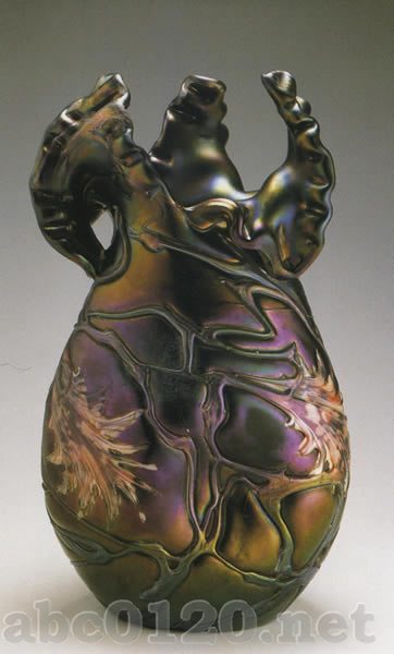 1900年以降 エリーザベト工場(ヴィルヘルム・ハベル) テプリツェ近郊のコシュチャニー 高さ24.4cm 北ボヘミア美術館,リべレッツ 無色ガラス、紫色の被せガラス,無色ガラスの装飾,ピンクと白のオパール・ガラスによる線状装飾,虹彩。出所:『ボヘミアのアールヌーヴォーグラス展』 Bohemian Art Nouveau Glass