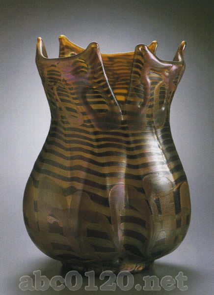 1900年以降 エリーザベト工場(ヴィルヘルム・ハベル) テプリツェ近郊のコシュチャニー 高さ19.3cm 地方美術館,テプリツェ 緑ガラス,褐色がかった黄色と赤のガラスによる線状装飾,虹彩。出所:『ボヘミアのアールヌーヴォーグラス展』 Bohemian Art Nouveau Glass