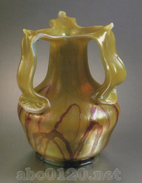1900ー05年 エリーザベト工場(ヴィルヘルム・ハベル) テプリツェ近郊のコシュチャニー 高さ17cm デュッセルドルフ美術館 無色ガラス、白オパールの被せガラス・明るい線の斑文と赤い線状の装飾,虹彩。出所:『ボヘミアのアールヌーヴォーグラス展』 Bohemian Art Nouveau Glass