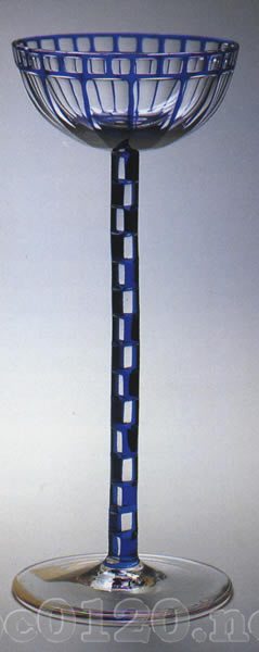 1907年 マイアズ・ネッフェ・ガラス工房 ヴィンペルク近郊のアドルフォフ デザイン:オットー・プルッチャー 高さ21cm 西ボヘミア美術館,プルゼン 無色ガラス,コバルト・ブルーの被せガラス,カットの装飾。出所:『ボヘミアのアールヌーヴォーグラス展』 Bohemian Art Nouveau Glass