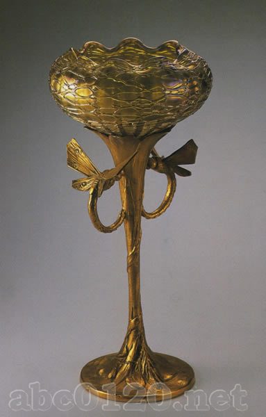形と共飾:1896年,manuf no.6479;diana chine ヨハン・レッツ・ヴィトゥヴェ クラーシュテルスキー・ムリーン(クロスターミューレ) 高さ23.5cm 国立工芸美術館,プラハ 緑のガラス,葉脈状の畝,無色の線状装飾,虹彩,金のせ。出所:『ボヘミアのアールヌーヴォーグラス展』Bohemian Art Nouveau Glass