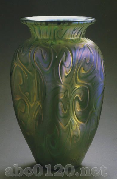 形と装飾:1898年,manuf no.7499/1/6;creta PhanomenGre 7499/I ヨハン・レッツ・ヴィトゥヴェ クラーシュテルスキー・ムリーン(クロスターミューレ) 高さ16cm ガラス・宝石美術館.ヤプロネツ・ナド・ニツー 緑のガラス,線状装飾,虹彩。出所:『ボヘミアのアールヌーヴォーグラス展』Bohemian Art Nouveau Glass