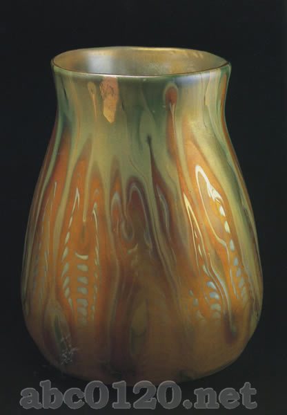 無色ガラス,黄色がかったォパールの被せガラス,線状装飾,流下紋の装飾,虹彩。形と装飾は,1900年のパリ万国博覧会のためにつくられたシリーズ作品によるもの。出所:『ボヘミアのアールヌーヴォーグラス展』Bohemian Art