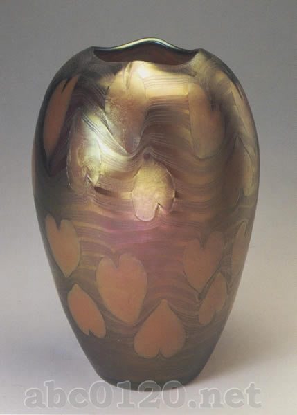 形と装飾:1902年,manuf.no.2/473;exhibition decoration 高さ17.5cm 国立工芸美術館、プラハ 無色ガラス,褐色系オパールの被せガラス,櫛目状装飾,ハー卜形象限による装飾,虹彩。出所:『ボヘミアのアールヌーヴォーグラス展』Bohemian Art Nouveau Glass