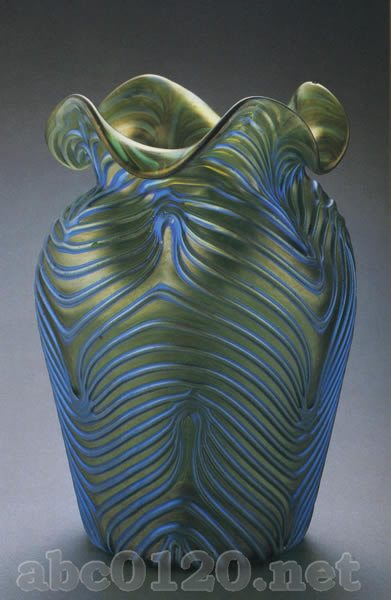 形:1901/02年 装飾:1902年,Formosa 高さ12.2cm 国立工芸美術館,プラハ 緑のガラス,引き流しによる線状装飾,虹彩。 "フォルモーザ(台湾)″ガラスは,1902年のライプツィヒ・フェアにおいて新製品として紹介された。出所:『ボヘミアのアールヌーヴォーグラス展』Bohemian Art Nouveau Glass