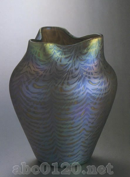 形と装飾:1902年頃 署名:底部にエングレーブィングで"Loetz Austria″と会社のマーク(交差する矢) 高さ13.9cm 地区美術館.クラトヴィ 製造者から1907年に取得 無色のガラス,ピンクのオパールの被せガラス,櫛目状装飾,虹彩。出所:『ボヘミアのアールヌーヴォーグラス展』Bohemian Art Nouveau Glass