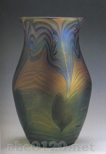 形と装飾:1902ー03年 高さ16cm 国立工芸美術館,プラハ 無色のカラス,ビンクの被せガラスと緑の濃淡,櫛目状装飾とハー卜形象眼装飾,虹彩。 シンプルな形態をした極めて人気のあつたタイプの装飾。出所:『ボヘミアのアールヌーヴォーグラス展』Bohemian Art Nouveau Glass