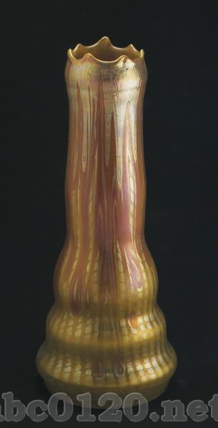 "フェノメーン″のジャンル358の装飾は,1900年のパり万国博覧会向けにデザインされたものの一つである。またこの装飾は,Eバカロヴィッツ・ゼーネ商会のために作られたガラスにしばしば用いられており,コロマン・モーザーがデザインした緑色系の青い"ルナ″ガラスを一層効果あるものとした。出所:『ボヘミアのアールヌーヴォーグラス展』Bohemian Art