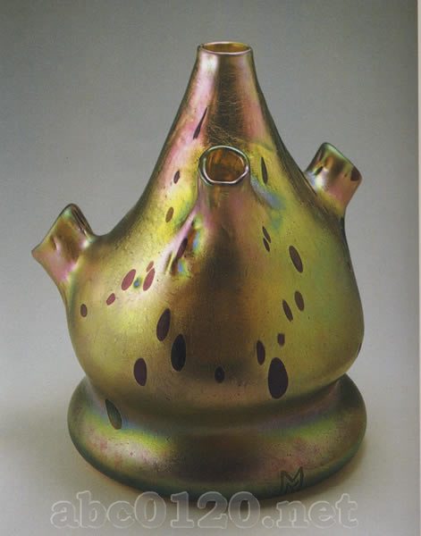 ウィーンのEバカロブィッツ・ゼーネの注文により制作無色のガラス.虹彩ガラスによる装飾,斑文装飾,虹彩。