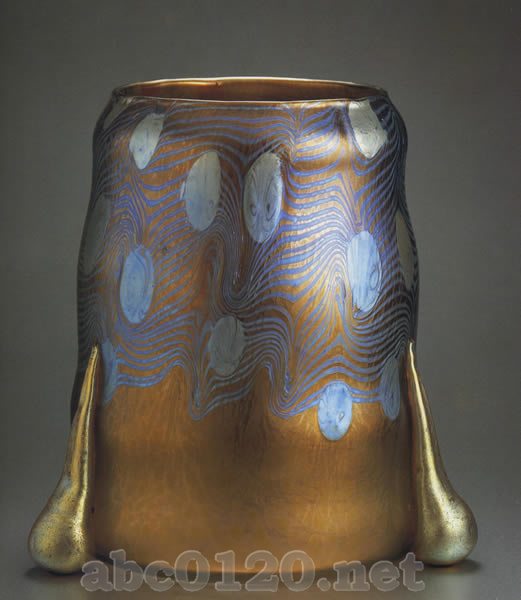 ウィーンのE.バカロヴィッツ・ゼーネの注文により制作。無色のガラス,茶の濃淡,鮮やかな斑文装飾,櫛目状装飾,象眼による縞状斑文,虹彩。