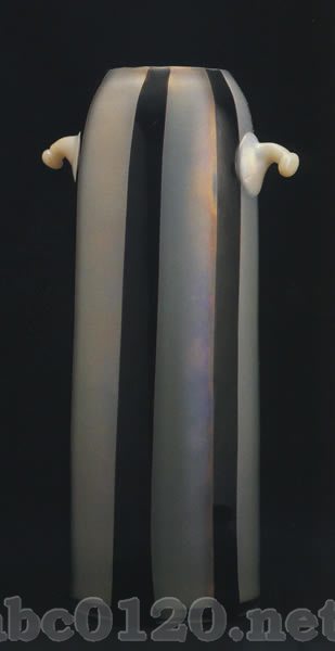 無色のガラス,白のオパールの被せガラス・垂直の黒の縞模様,虹彩.。