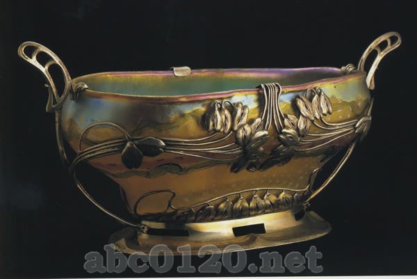 形と装飾:1904年,manuf.no 85/520;opal gerippt mitPapil1on 高さ82.2cm 国立工芸美術館、プラハ ウィーンのE.バカロヴィッツ・ゼーネの注文により制作、無色のガラス、白系の被せガラス,斑文と畝の装飾,虹彩,真鍮枠填め込み。出所:『ボヘミアのアールヌーヴォーグラス展』Bohemian Art Nouveau Glass