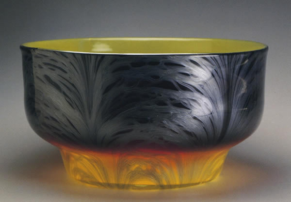 黄色のオパール・ガラス,暗赤色の濃淡,櫛目状装飾,無色の被せガラス。出所:『ボヘミアのアールヌーヴォーグラス展』Bohemian Art