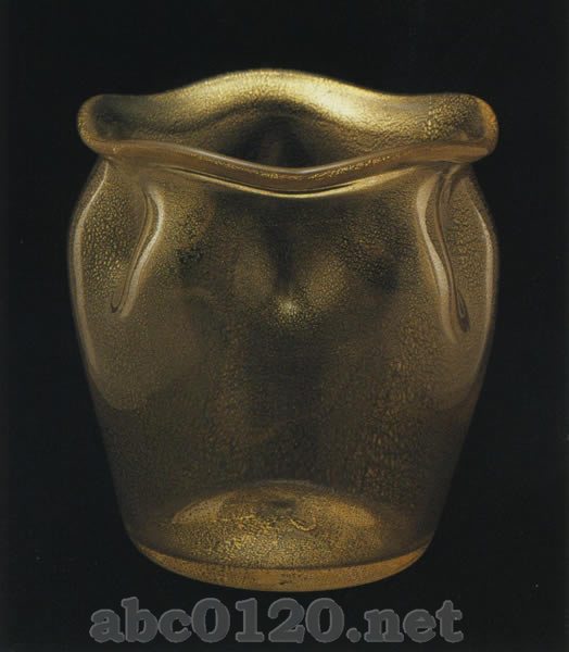 形と装飾:1908年,manuf.no.5671;goldglas Ausf. 91 高さ8.4cm 国立工芸美術館,プラハ 無色ガラス,金箔片の熔着装飾。出所:『ボヘミアのアールヌーヴォーグラス展』Bohemian Art Nouveau Glass