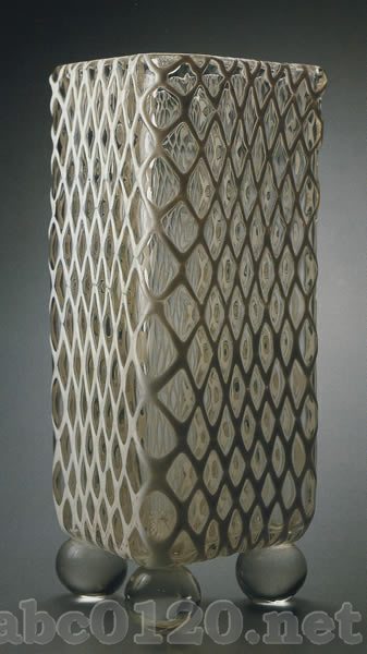形と装飾:フランツ・ホフシュテッター,1911年 高さ18.5cm 地区美術館,クラトヴィ 無色のガラス,白のオパール・ガラスによるダイヤモンド文装飾。 1911年から12年にかけてウィーンでひらかれたオーストリア美術・工芸展のための作品群の一部。出所:『ボヘミアのアールヌーヴォーグラス展』Bohemian Art Nouveau Glass