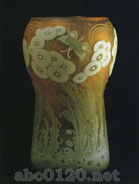 無色のガラス,ピンクと緑と白のオパールの被せガラス,エッチングによる装飾・菊と蝶文装飾。