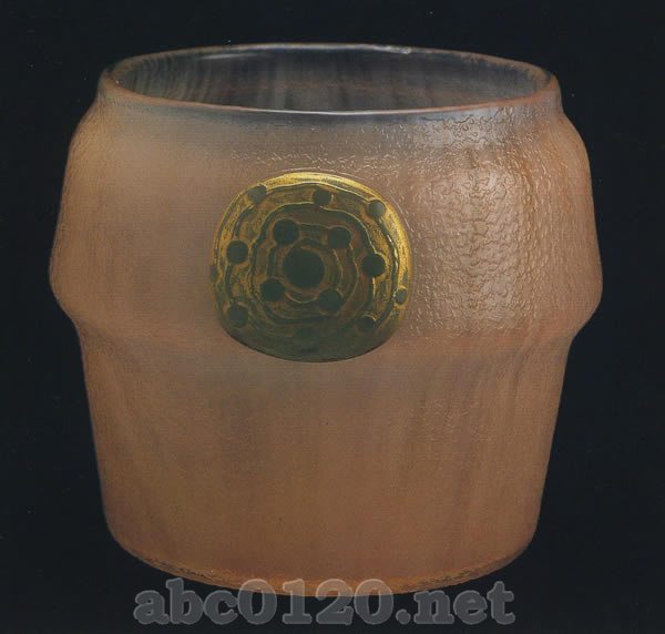 形:アドルフ・ベッケルト,1910年 装飾:1909年, rosenquarz Ausf.103 高さ12.2cm 個人蔵,ウィーン 無色のガラス,ピンクの大理石模様の層,明るい緑のガラス装飾,エッチング装飾,金彩。ガラス工房の最新製造プログラムのためにベッケルトがデザインした作例。出所:『ボヘミアのアールヌーヴォーグラス展』Bohemian Art Nouveau Glass