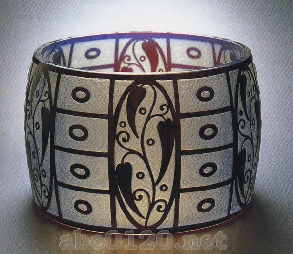 ウィーンのオーストリア美術・産業博物館の注文により制作白系のオパール・ガラス.無色と赤の被せガラス・エッチングによる装飾。