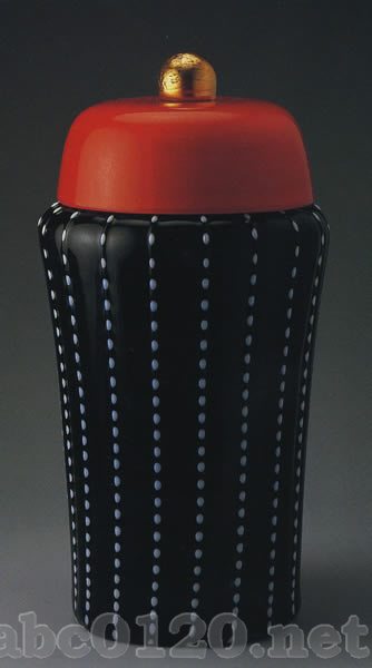 暗褐色のガラス,白のオパール・ガラスの点文による垂直な畝/蓋:黒のガラスに赤いオパールの被せガラス,ツマミは無色のガラスに金彩。