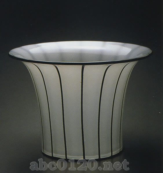 ウィーンのオーストリアエ作連盟の注文により制作,無色のガラス,白のオパールの被せガラス,黒の線による装飾。
