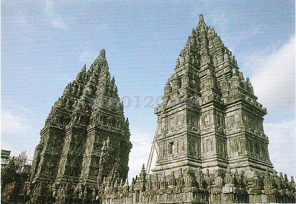 プランバナン遺跡群は、大部分が8世紀中頃~9世紀にかけてつくられた.建物はいずれも、人間界をあらわす基壇、人間と神のかかわりをあらわす堂、神々の住む天上界をあらわす尖塔の3層から構成されており、ヒンドゥー教の世界観が見事に表現されている。