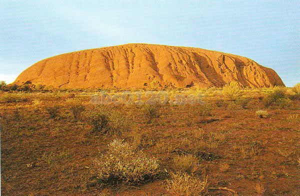 オーストラリアの中央部に位置する通称エアーズ・ロック。周囲約9km、高さは348mの一枚岩は、地殻変動と浸食によって、現在の姿になったと考えられている.ここから約30km離れた所にある、カタ・ジュター(たくさんの頭の意。通称オルガ山)は、36の巨大な岩が迫力ある不思議な景観をつくりだしている。