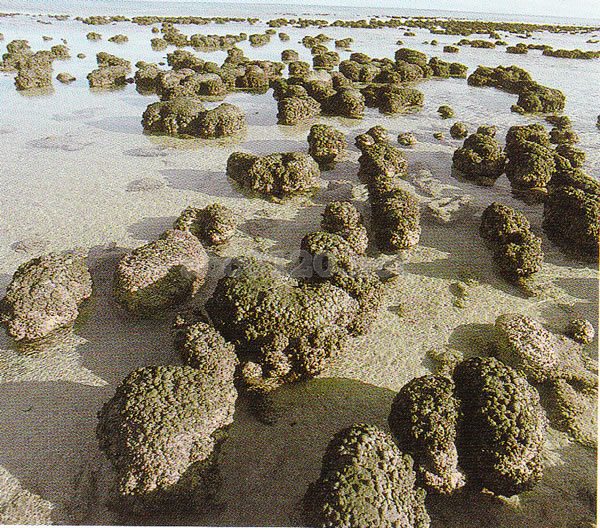 ザトウクジラの繁殖場所、アオウミガメ産卵の南限、シャークベイ二セマウスやジュゴンの生息地というふうに、シャーク湾は海洋生物の宝庫だが、それだけではない。シャーク湾のハメリン・プールには、 ストロマトライトという岩がある.海底に繁殖する海藻が海中に酸素を供給し、ラン藻などの微生物が砂粒を結びつけ、岩となり、生長するのだ。最古のものは、35億年前の地球最古の生命体の化石という貴重な「岩」である。