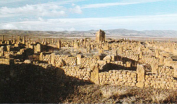 オーレス山地のベルベル族を牽制する砦として建設されたこの町は、中心を東西に走るデクマススと、南北に走るカルドの2つの大通りが交差する典型的なローマの計画都市だ。紀元100年、 トラヤヌス帝によってつくられ、その後、付近のベルベル族も同化し、 一大文化都市を形成した。