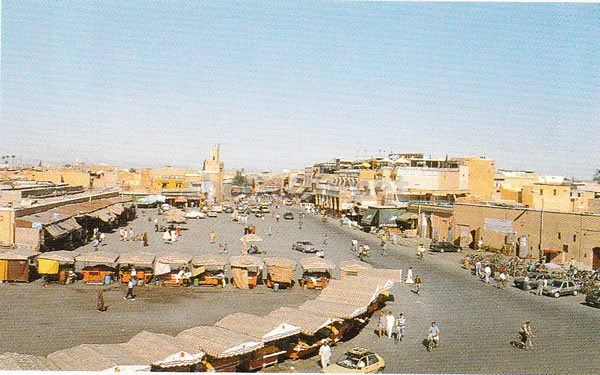 城壁に囲まれた旧市街には、ムワッヒド朝時代のクトゥビアのミナレットや、アグーノ門などがあり、狭い路地が網の目のように広がり、 スーク(市場)がひしめいている.迷路のようだが、なぜかどの道も中心をなすジャマ・エル・フナ広場に行き着く。かつて公開死刑場だった「死人の集会場」と呼ばれるこの広場は、無数の屋台が立ち、ヘビ使いやアクロバットなどの大道芸人、占い師、講談師などが芸を披露する。その周りには観客があふれ、まるでお祭りである.何世紀にもわたって変わらず、現在も同じエネルギーを発散して“栄えて”いる広場は、世界でもここ以外にないのではあるまいか。出所:世界遺産の旅