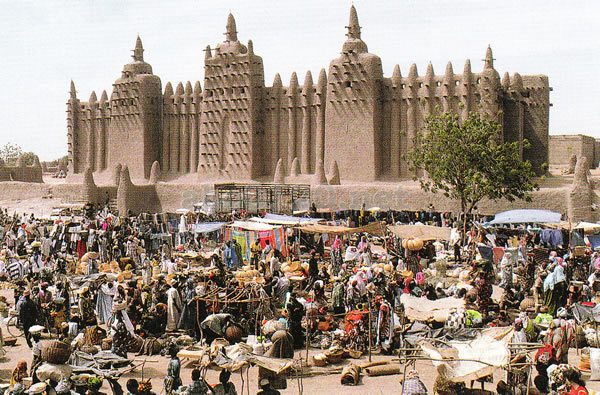 モスクの壮大さと、美しい民族衣装を身にまった女たちのきらびやかさは、ほかの町ではなかなか見られない。交易都市としての最盛期を彷彿とさせる賑わいは、がっては双子の姉妹とも呼ばれ、運命共同体的な存在であったトンブクトゥの、朽ち果てつつある現在と対照的である。出所:世界遺産の旅