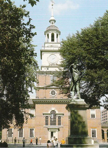 「すべての人は平等につくられ、創造主によって一定の奪うことのできない権利を与えられ、そのなかには、生命、自由および幸福の追求が含まれることを、われわれは自明の真理であると信ずる」。当時としては画期的な人権思想を盛り込んだ、アメリカ独立宣言文の一節である。1776年7月4日、フィラデルフィアのこの建物で、トマス・ジェファソン起草の独立立言は採択された。独立記念館は、1749年に完成した赤レンガ造りの「すべての人は平等につくられ、創造主によって一定の奪うことのできない権利を与えられ、そのなかには、生命、自由および幸福の追求が含まれることを、われわれは自明の真理であると信ずる」。当時としては画期的な人権思想を盛り込んだ、アメリカ独立宣言文の一節である。1776年7月4日、フィラデルフィアのこの建物で、 トマス・ジェファソン起草の独立宣言は採択された.独立記念館は、1749年に完成した赤レンガ造りの2階建てで、上部には時計、鐘楼、八角形のドーム、尖塔がある。アメリカ人にとって、建国の聖地である.周辺は独立記念国立歴史公園とされ、独立にまつわる記念建造物が集中している。