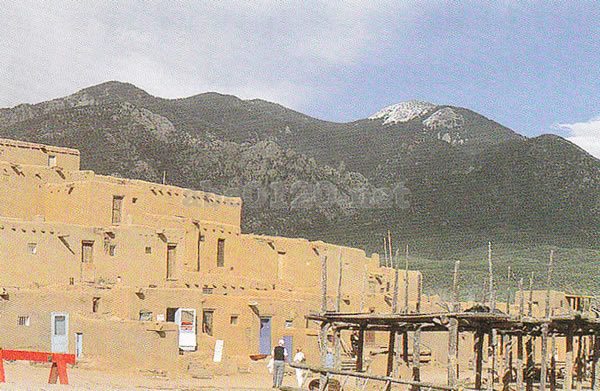 芸術家の町として知られるサンタ・フエの北90km、人口2500人のタオスの郊外に、独白の文化を育んできた先住民プエブロ族の集落、ブエブロ・デ・タオスがある。集落は中央を流れる小川を中心に、円形につくられており、1350年頃に建てられたタオスは、現在も人が住むものとしては最古の家である、日干しレンガを積み上げ、泥で塗り固めた壁が大きな特徴で、骨組みは木を使い、屋根も泥で塗り固めてある。もともとは入口外に扉も窓もなく、上階へは外から梯子をかけて出入りした。昼夜の温度差が激しく、乾燥したこの地方の風土に適した建築である。