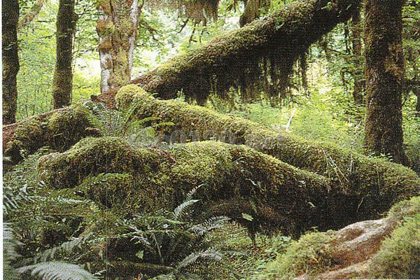 太平洋沖を流れる冷たいカリフォルニア海流からの湿った空気は、オリンピック山地(最高峰はオリンパス山で標高2428m)にぶつかって、西側斜面に年間3000~4000mmの雨をもたらす。温帯では珍しい多雨林はシダ類や地衣類、また針葉樹の樹皮を覆うコケなどの、着生植物の生育を促している。奈良県とほぼ同じ面積(3628k㎡)のオリンピック国立公園は、温帯多雨林だけでなく、氷河の浸食による険しい山々、約90kmにおよぶ未開発の海岸地帯、そして温泉など、いくつもの表情をもっている。シアトルから近いこともあって、訪れる観先客も多い。