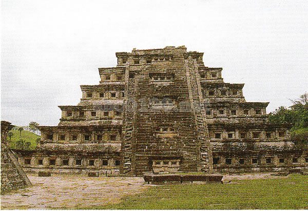 この遺跡は小高い丘上にある「大都市」と「タヒン・チコ]、「小都市]に分かれる。600~700年に住設されたという大都市の壁龕ピラミッドは小ぶりだが、6層からなる壁には、精巧な窓のような窪みがついている。かつて窪みの内側は赤、外枠は青く彩色されていた。この窪みは全部で365あり、住物自体が太陽暦の1年をあらわしていたと、推察されている。
