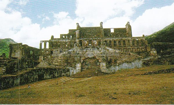 フランスのヴェルサイユ宮殿を模したサン・スーシ城は1807年に建設が始まった,現在は城の礼拝堂だけが往時の姿を見せている、その背後のラ・フェリエール山頂には城塞シタデルがある,1817年に完成した高さ50m、厚さ5mの城塞の斜提には、フランス軍から強奪した150の大砲が並ぶ。1820年、黒人王国は消滅したが、この城塞は自由と独立のシンボルである。1842年、これらの遺構は地震で破棄されたが、現在は国立歴史公園として、保存されている。出所:世界遺産の旅
