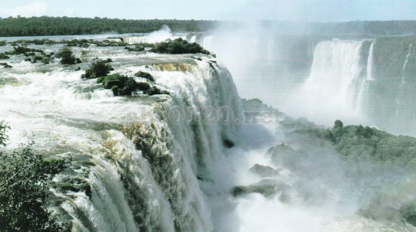 ブラジル、アルゼンチン、パラグアイが国境を接するあたりの熱帯の森。ここを流れるイグアス川はパラナ川の支流で、水はラ・プラタ川を経てやがて大西洋に注く。イグアス川が大きく進路を変えた所に、巨大な玄武岩の崖が待っている。行き場を失った水は轟音とともに80m下に向かって落下する。先住民グアラニー族の言葉で「大きな水」を意味するイグアスの滝だ。先住民の間では古くから知られていたが、初めて滝を目にした西洋人はスペイン人のアルベア・デ・バカで、1541年のことだった。