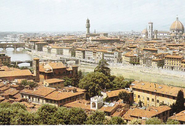 ミケランジェロ広場から眺めてみる。アルノ川のほとりに、赤茶色の屋根と白壁の家並みが広がる。その美しさは、まるでルネサンス時代にタイムスリップしたようだ。ほとんど同じ高さに揃った甍の波の中央に、ひときわ高くそびえる建物が3つある、ヴェッキオ宮、ジョットの鐘楼、ドゥオーモ、これらがアクセントになって、まるで絵のように美しい。