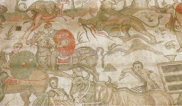 今世紀になってシチリア島で発掘されたこの遺跡は、3~4世紀の建築物で、古代ローマの貴人の邸館である、3500㎡におよぶ広さを有レたいへん重要かつ権威のあった人物の邸宅であろうと推測される。