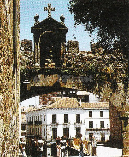 カセレスの町の歴史は古い。ローマ軍が先住民を追い出して町を開いたのが、紀元前19年のこと。8世紀初めにイスラム教徒が侵入して、新たな城壁を築いた。300m×200mぼどの広さの城壁内が、現在「旧市街」と呼ばれる。この狭い旧市街の中に、カセレスが全盛を極めた15~16世紀の建物が立ち並んでいる。城壁の入口「星のアーチ]をくぐると、そこはまるで時が止まったかのように、中世の世界だ。ゴシック様式の建築物の数々。当時、新大陸との貿易を独占していたカスティーリヤ王国の繁栄ぶり、国内の交通の要所としてのこの町の富裕ぶりが想像できよう。