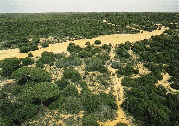 ヨーロッパの野生動物にとって「最後の楽園」といわれているのがドニャーナ国立こうえんだ。大西洋岸グアダルキビール川河口から、アンダルシア3県にまたがるスペイン最大の広さの国立公園である。その面積は、隣接する自然公園を含めると730k㎡におよぶ。園内には、動物が徘徊する湿原地帯「マリスマス」、固い砂地帯「アレナス・エスタピリサダス」、そして如晩もの砂丘が、年間6mも移動するという動く砂丘地帯「ドゥナス・モビレス」の3つの自然環境がある.ここに生息する動植物類の数は、鳥類128種、両生類11種、爬虫類18種、哺乳類28種である.ダマジ力、アカシカ、イノシシ、ノウサギなどのほか、絶滅に近いスペインオオヤマネコや、ここにしかいないインペリアルイーグルなどの固有種も観察される。温暖なこの地は、越冬する渡り鳥のかっこうの楽日にもなっている。出所:世界遺産の旅