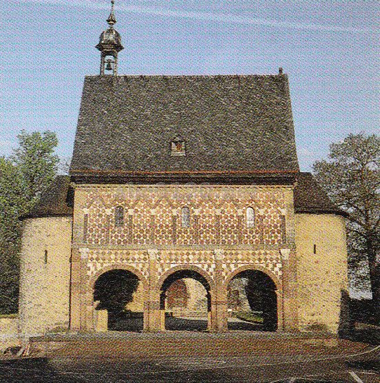 「王の門」は、8世紀末~9世紀初頭に建てられ、現存する聖堂よりも古い。カール大帝の戦勝を記念して建てられた儀式場説が有力であるが、その役割ははっきりしない。1984~1985年に行われた発掘調査で、最初に建てられた修道院の礎石が発見され、居住区を取り囲むように聖堂や各施設が存在していたことが判明した。出所:世界遺産の旅