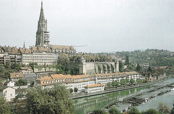 アーレ川にかかるニーデック橋と、ツィットグロックタームと呼ばれる時計塔にはさまれた地域が、中世の町並みの旧市街。ここにはスイスで最も高い塔をもつミュンスター大聖堂がある。1405年の火事で、ベルン市街の大部分の建物とともに焼失したが、1573年に再建された。高さ100mの尖塔ができあがったのは1893年のことである。