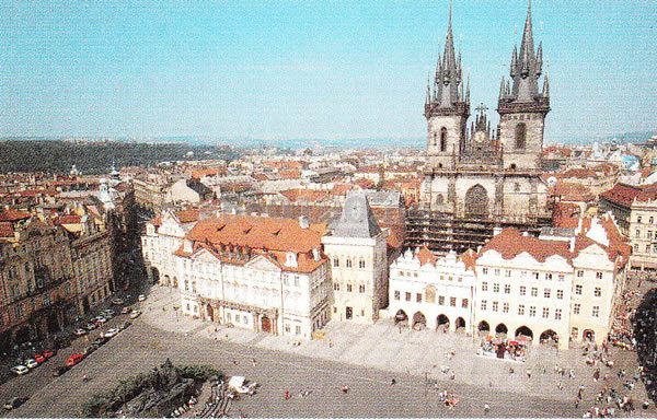 プラハの心臓部の旧市街広場は、11世紀に形づくられ13~14世紀に整備された。中央には宗教改革の先駆者ヤン・フスの像が立ち、歴史的な建造物が並んでいる。広場の東に建つ、1365年建造のゴシック様式のティーン教会の正式名称は、「ティーンの前の聖母マリア教会」。裏手にティーン(税関)があったことからその名がついた。広場西には天文時計が有名な旧市庁舎がある。