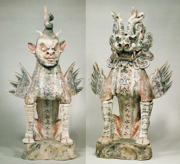 この一対の魌頭は一体が人面獣身、一体が獅子面獣身である。恐しい形相をし、頭には大きな角をもち、背には羽根をもつ怪獣の姿をしている。灰陶の地に胡粉で下化粧をし、その上に加彩をしている。墨・朱・緑・紫の絵の具で雲文や花唐草文を丁寧に描いている。また一部金彩が施されているところがある。この魌頭に酷似する作品が陝西省礼泉県の鄭仁泰墓(龍朔三年〈663〉没)から出土している。この一対の魌頭も西安周辺の初唐の王侯墓出土品とみてまず間違いのないところだろう。 出所:中国陶磁器展1992静嘉堂文庫美術館