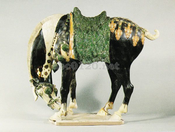 首を低く下げ、口を足元に寄せた珍しい姿の俑である。唐三彩の馬は数多く作られているが、同じ姿のものはないといってよいほど変化に富んでいる。これは色彩や装飾の多様性もさることながら、表現が生気に富み、馬の自然な表情に深い関心が寄せられているからである。出所:中国陶磁器展1992静嘉堂文庫美術館